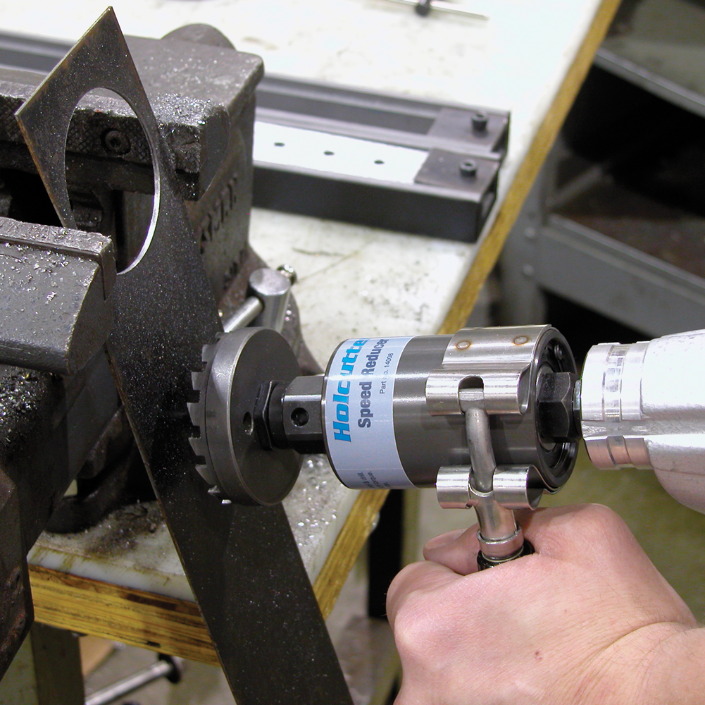 The Speed Reducer is for large diameter Holcutters or for all sizes when drilling thru stainless steel to improve tool life. It slows the RPMs down to a more effective cutting speed using a 4:1 gear ratio. The Speed reducer can be mounted directly to a 1/2″ drill (pictured) or mounted in a 1/2″ chuck using the triple-flatted adapter (04943). Holcutters mount directly to the Speed Reducer using the Quad-Lead Thread System.