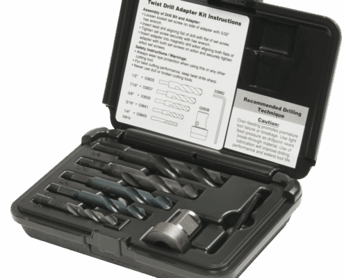 Easily installs in a Hougen Magnetic Drill* without removing drill arbor and coolant system. Adapter accepts a modified 118° twist drill with a 1/4″ flatted shank that secures in adapter with a set screw. A convenient kit is available containing all items listed below.